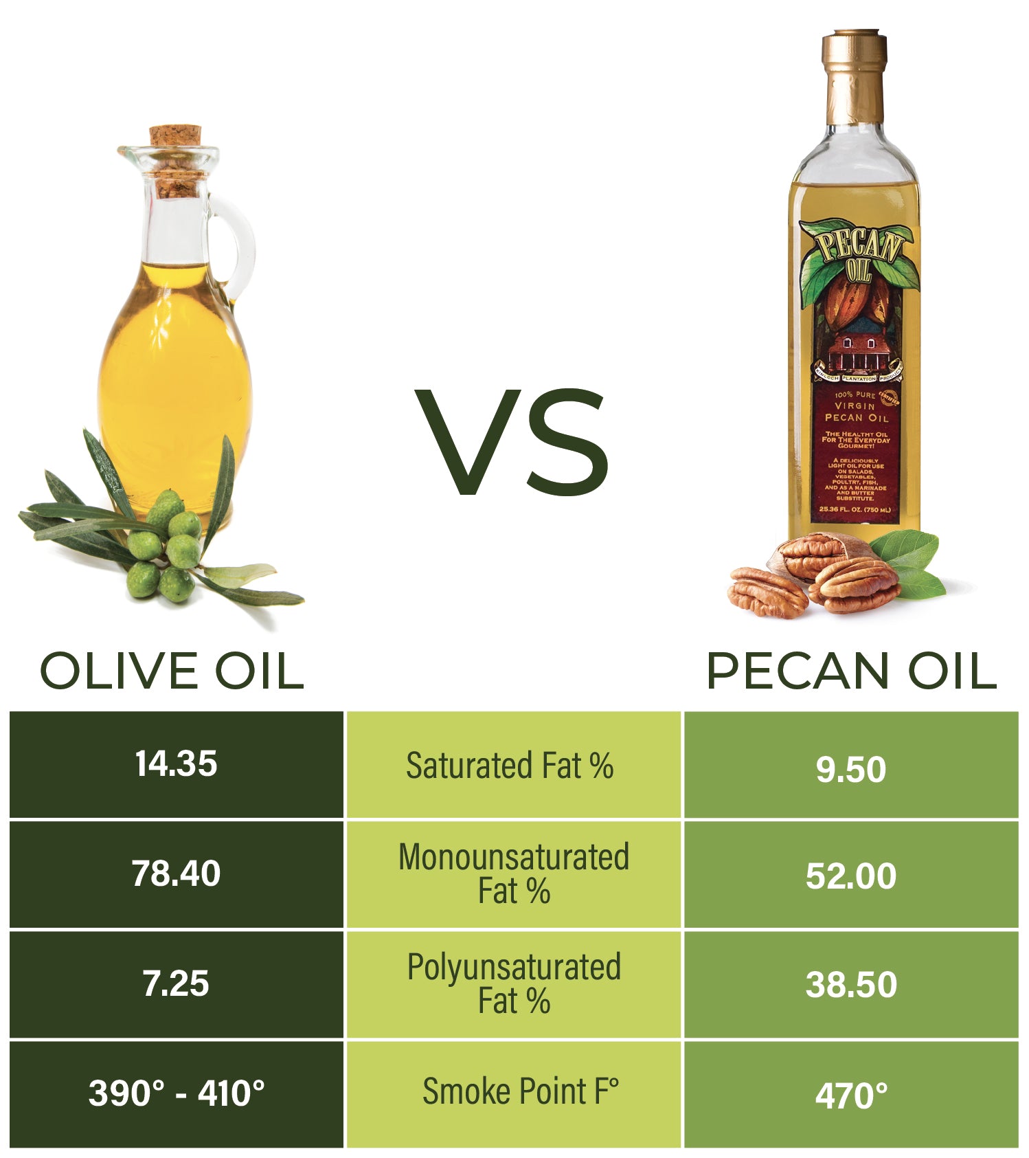 Pecan oil is lower in saturated fat and higher in polyunsaturated fat than olive oil. It has a higher smoke point too! Less smoke in your kitchen when searing.